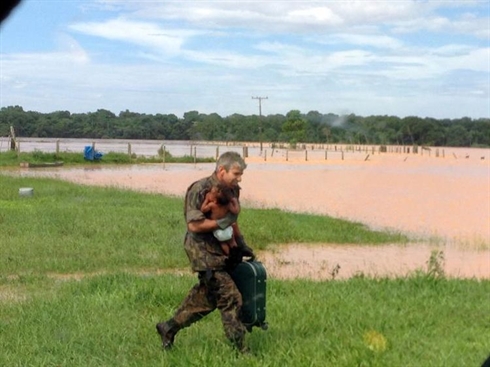 | Un officier de l'armée brésilienne porte secours à un bébé dans une zone rurale affectée par de fortes pluies dans l'État de l'Espirito Santo, le 26 décembre |