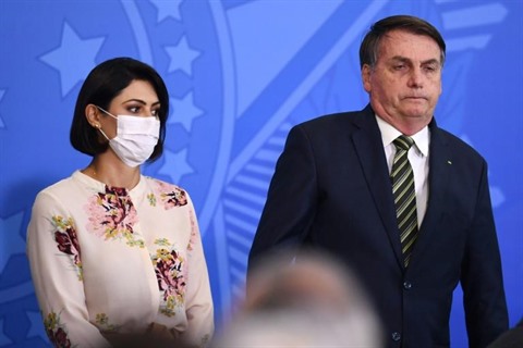 | Le président brésilien Jair Bolsonaro et son épouse Michelle lors de la cérémonie de prise de fonctions du nouveau ministre de la Justice, Andre Mendonca, à Brasilia le 29 avril. |