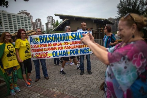 | À Rio, des partisans de Jair Bolsonaro attendent devant l'entrée du complexe de la résidence du président élu, où Sergio Moro s'est rendu, le 1er novembre. |