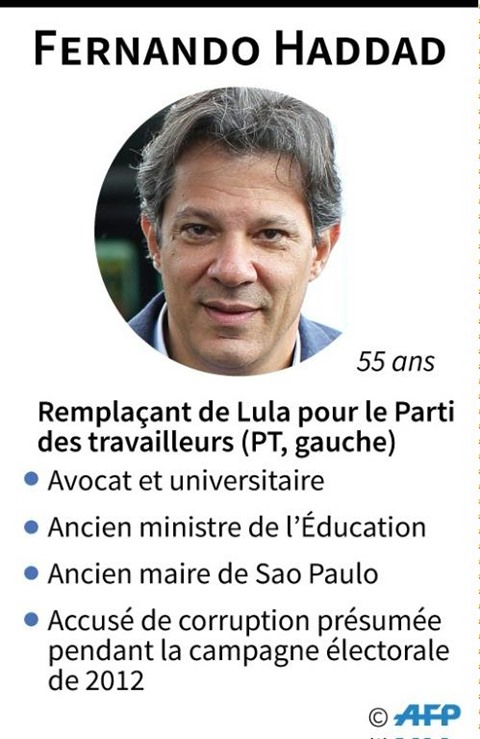 Inscrit initialement en août comme candidat à la vice-présidence sur le ticket de Luiz Inacio Lula da Silva, alors grand favori des sondages, il a été propulsé candidat officiel du Parti des Travailleurs (PT) le 11 septembre. Ce jour-là, l'ex-président (2003-2012), incarcéré depuis avril pour corruption, a finalement jeté l'éponge, après attendu la date limite, multipliant les recours contre son inéligibilité. Partant du principe que Lula est si populaire qu'il pourrait faire élire un lampadaire, Fernando Haddad s'est présenté volontiers comme le "lampadaire de Lula". Un lampadaire qui a réussi à se hisser au 2e tour dimanche 7 octobre.
