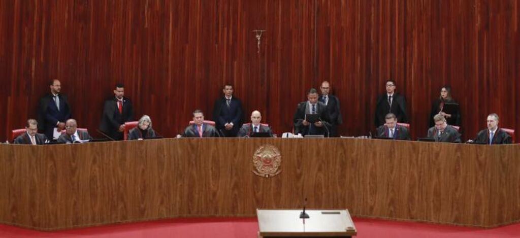 | Assemblée plénière du Tribunal électoral supérieur du Brésil lors du deuxième jour du procès de l'ex-président Jair Bolsonaro, le 27 juin à Brasilia. |
