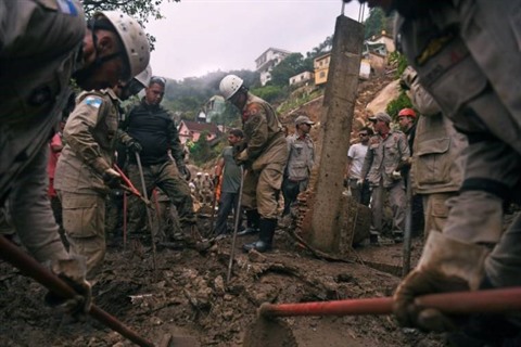 | Des secouristes creusent à la recherche de disparus, le 19 février, dans le quartier de Caxambu à Petropolis, au Brésil. |