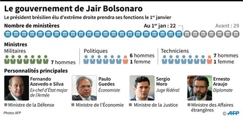 Le gouvernement a été resserré dans un souci d'efficacité (sept de moins que le précédent) mais est composé de personnalités en majorité inexpérimentées, ce qui n'a pas altéré l'optimisme des marchés qui attendent des mesures ultra-libérales. Les ministres, parmi lesquels sept militaires à la retraite et seulement deux femmes, ont été intronisés au cours de cérémonies protocolaires, au lendemain de l'investiture en grande pompe du président Bolsonaro.