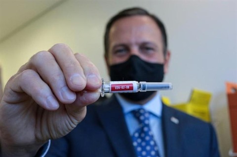 | Le gouverneur de Sao Paulo, Joao Doria, montre le vaccin développé par l'entreprise chinoise Sinovac Biothech, le 21 juillet à Sao Paulo, au Brésil. |