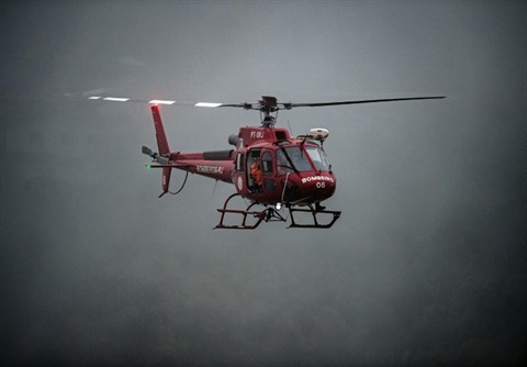 | Un hélicoptère des pompiers survole la zone victime d'un glissement de terrain à Petropolis, au Brésil, le 16 février. |