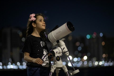 | Nicole Oliveira, jeune astronome qui chasse les astéroïdes, derrière son télescope, le 21 septembre à Fortaleza, au Brésil. |