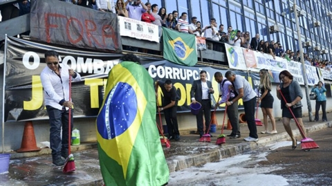 | Des fonctionnaires manifestent le 30 mai, à Brasilia, pour réclamer la démission du ministre de la Transparence, Fabiano Silveira. |