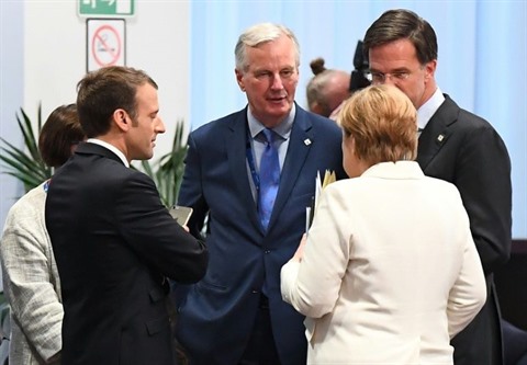 | Le président Emmanuel Macron (gauche), le négociateur du Brexit Michel Barnier (centre), la chancelière allemande Angela Merkel et le Premier ministre néerlandais Mark Rutte à Bruxelles le 20 octobre. |