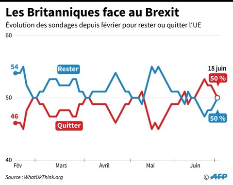 Mais plusieurs sondages rapportent un glissement sensible en faveur du camp du "remain", le maintien dans l'UE, qui rattrape son retard en faisant désormais jeu égal à la moyenne de six dernières enquêtes d'opinion.
