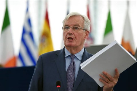 | Michel Barnier devant le Parlement européen à Strasbourg, le 13 mars en France. |