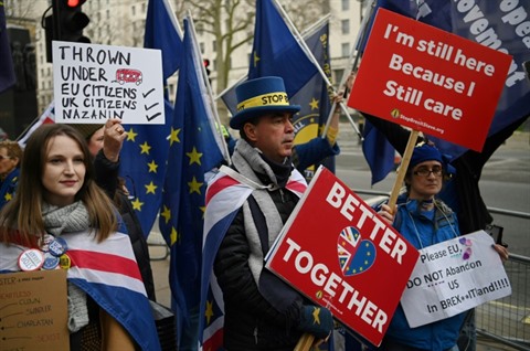 | Des manifestants anti-Brexit devant Downing Street, résidence du Premier ministre, à Londres le 8 janvier. |