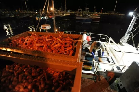 | Un pêcheur ramène au port de Pittenween sa cargaison de crevettes en décembre 2018, en Écosse. |