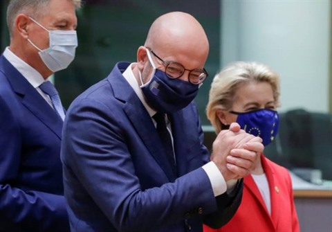 | Le président roumain Klaus Werner Iohannis (gauche), le président du Conseil européen Charles Michel (centre) et de la Commission, Ursula von der Leyen, le 1er octobre à Bruxelles lors d'un sommet européen. |