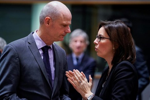 | La ministre française des Affaires européennes Amélie de Monchalin (droite) et le ministre néerlandais des Affaires étrangères Stef Blok lors d'une réunion à Bruxelles, le 25 février. |