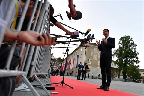 | Le chancelier autrichien Sebastian Kurz, hôte du sommet européen informel de Salzbourg, s'adresse aux journalistes au début de la réunion, le 19 septembre |
