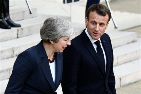 | Le président français Emmanuel Macron accompagne la première ministre britannique Theresa May à l'issue de leur entretien à l'Élysée, à Paris le 9 avril. |