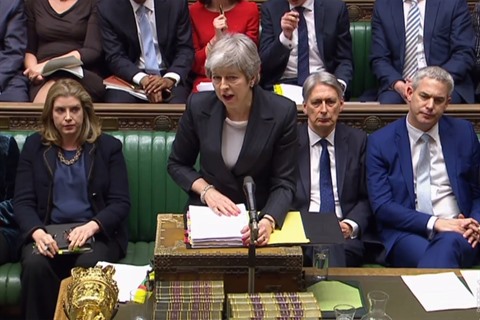 | La Première ministre britannique Theresa May (debout), le 20 mars à Londres. |