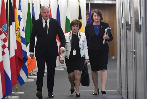 | Arlene Foster, cheffe de file du DUP (droite), la députée européenne du DUP Diande Dodds et le négociateur du Brexit pour l'UE, Michel Barnier, le 9 octobre, à Bruxelles. |