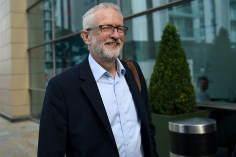 | Le chef du Labour, principal parti d'opposition, Jeremy Corbyn, se rend à une réunion de son cabinet fantôme, le 2 septembre 2019 à Salford. |
