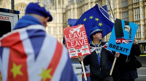 | Des manifestants anti-Brexit devant le Parlement britannique à Londres, le 12 février. |