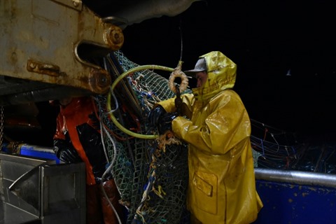 | Des pêcheurs sur le pont du chalutier dans les eaux anglaises de la Manche, le 28 septembre. |
