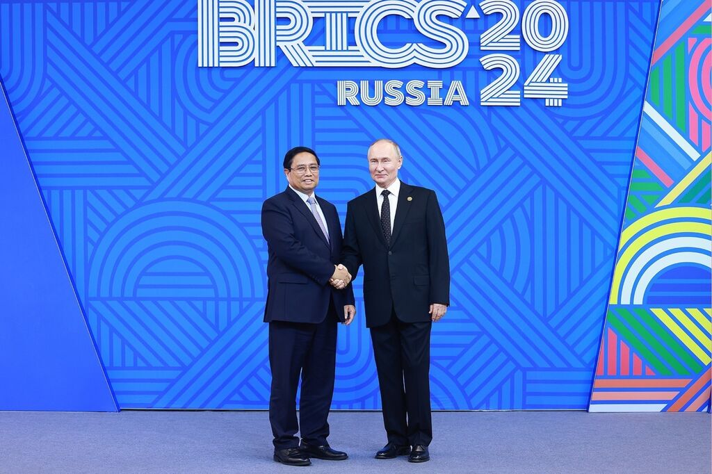 | Le président russe Vladimir Poutine, président des BRICS 2024, accueille le Premier ministre vietnamien Pham Minh Chinh (gauche), le 23 octobre dans la ville russe de Kazan. |