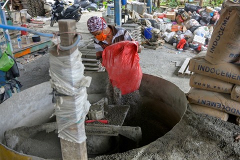 | Des déchets plastiques réduits en petits morceaux mélangés à du ciment et du sable pour être transformés en briques, le 7 avril 2021 à Jakarta, en Indonésie. |