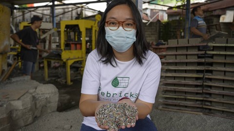 | Novita Tan, cofondatrice de Rebrick, montre des déchets plastiques réduits en petits morceaux qui seront transformés en briques, le 7 avril 2021 à Jakarta, en Indonésie. |