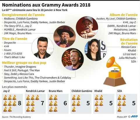 >>Grammy Awards : Jay-Z, Kendrick Lamar et Bruno Mars en pole position