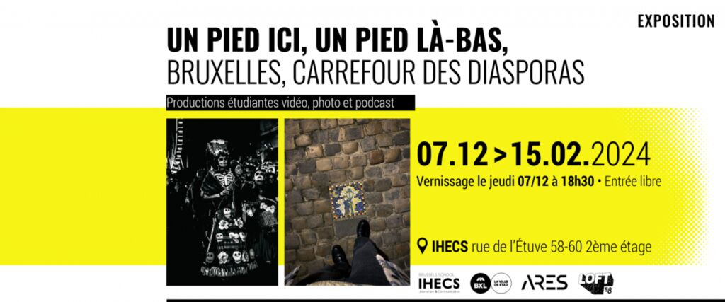 L’exposition intitulée “Un pied ici, un pied là-bas, Bruxelles, Carrefour des diasporas” est organisée dans le cadre de la Chaire de la solidarité internationale de Bruxelles (résultat d’une collaboration entre cette ville et l’IHECS). Elle est soutenue par l’Académie de recherche et d’enseignement supérieur (ARES) et de LOFT 58 (cafétéria des étudiants de l’IHECS).