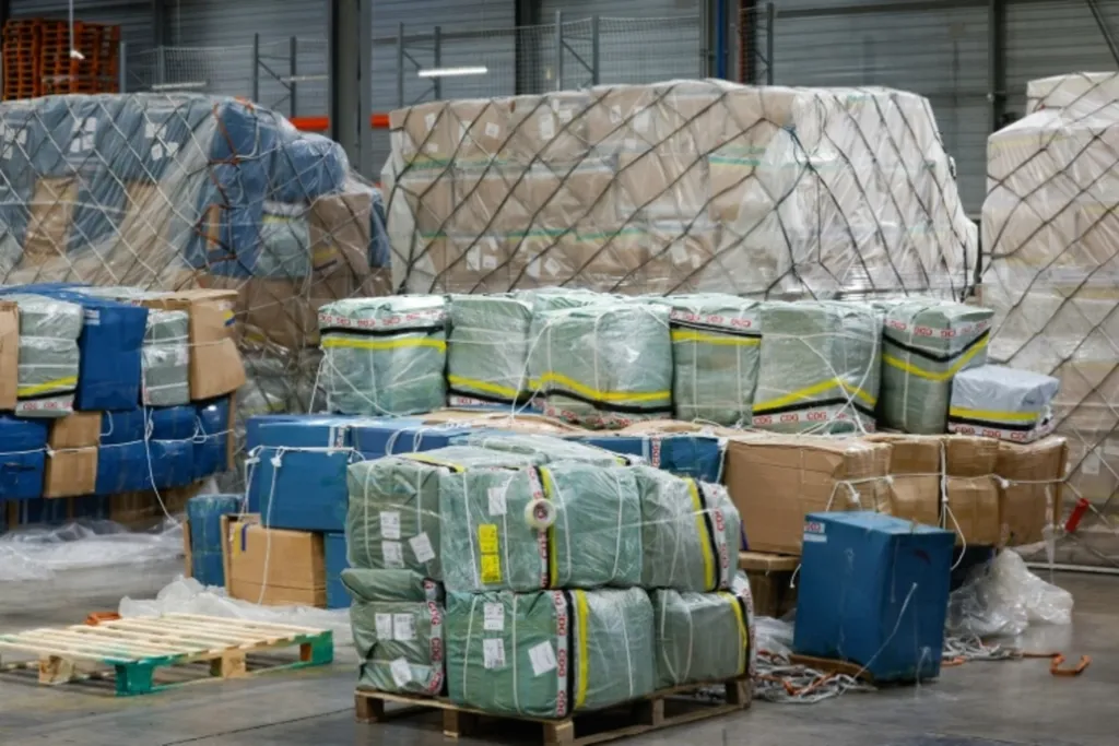 | Des colis de fret aérien dans un entrepôt de l'aéroport de Roissy-Charles de Gaulle. |