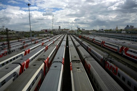 | Des trains de la compagnie russe RZD parqués sur les voies à Moscou, le 13 mai. |