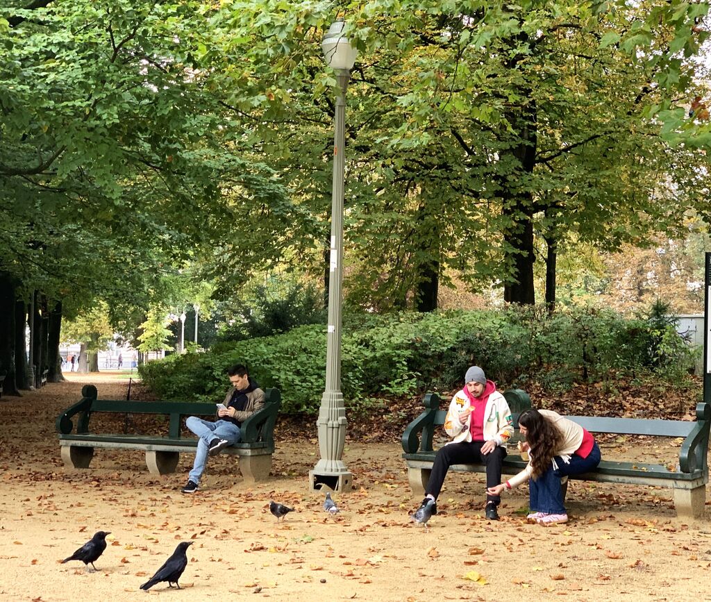 | Des touristes espagnols au Square du Petit Sablon, à Bruxelles. |