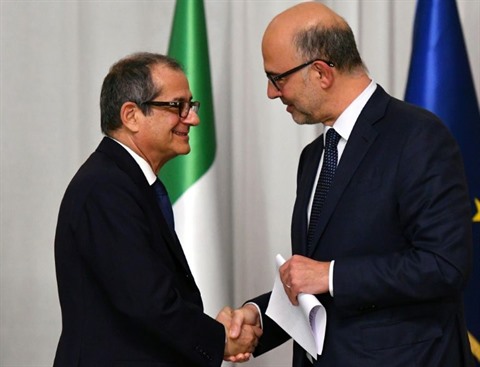 | Le ministre italien de l'Économie et des Finances, Giovanni Tria (gauche), et le commissaire aux Affaires européennes, Pierre Moscovici, le 18 octobre à Rome. |