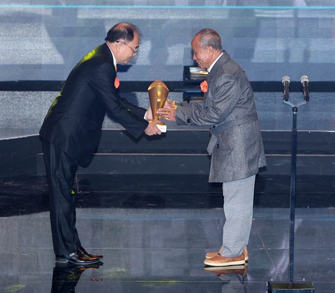 | Bùi Luong (droite) reçoit la Coupe de la Victoire, le 17 janvier 2017 à Hanoï. |