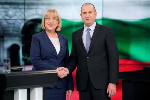 | Le candidat Rumen Radev et sa compétitrice Tsetska Tsacheva, tous deux se présentant pour la présidence de la Bulgarie, se serrent la main avant un débat télévisé le 10 novembre 2016 à Sofia. |