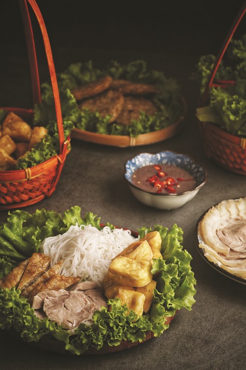 Les midis, les Hanoïens, quelle que soit leur profession, se rassemblent autour d’une petite table et commandent la fameuse assiette de bún đâu avec des cha côm (pâté de porc au jeune riz gluant) frits, accompagnée d’un bol de mam tôm.