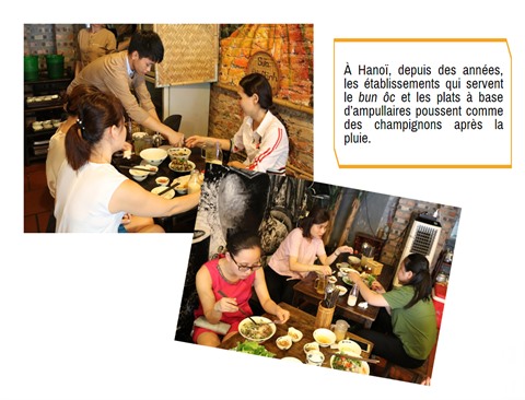 À Hanoï, depuis des années, les établissements qui servent le bun ôc et les plats à base d’ampullaires poussent comme des champignons après la pluie. Certains d’entre eux existent depuis longtemps et perpétuent le métier de générations en générations tels que le bun ôc de Hoe Nhai, le bun ôc de Mme Luong dans la rue Khuong Thuong et celui de Mme Huê, pour ne citer qu’eux.