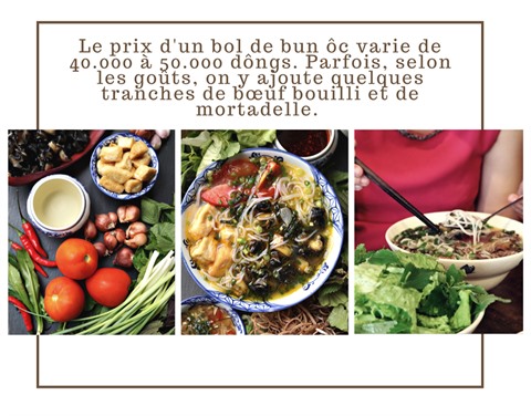 "Ma mère me raconte que quand elle était petite, elle emmenait souvent ses frères et sœurs à la +chasse+ aux escargots dans les champs. Ces mollusques, après avoir macérés dans de l'eau propre pendant plusieurs heures, étaient ensuite préparé en bun ôc pour le plus grand bonheur de la famille…", a partagé Mme Thu.