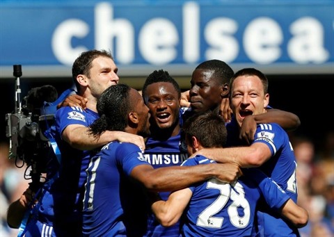 | La joie des joueurs de Chelsea, champions d'Angleterre, après leur victoire, 1-0, face à Crystal Palace, le 3 mai 2015 au stade de Stamford Bridge à Londres. |