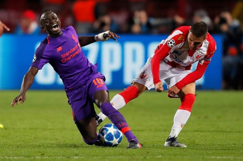| L'attaquant de Liverpool Sadio Mané perd un duel avec un défenseur de l'Étoile Rouge, le 6 novembre à Belgrade. |