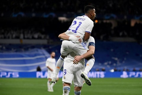 | Le buteur Rodrygo enlacé par le capitaine du Real Karim Benzema, également buteur, face à Chelsea en Ligue des champions à Madrid, le 12 avril. |
