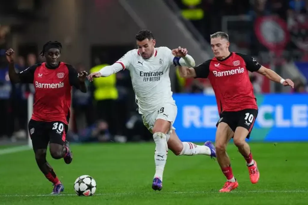 | Le capitaine de l AC Milan Théo Hernandez a touché la transversale contre Leverkusen à la BayArena, le 1er octobre |