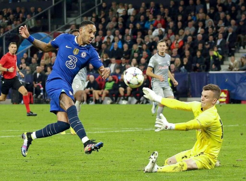 | L'attaquant de Chelsea, Pierre-Emerick Aubameyang (gauche), face au gardien suisse de Salzbourg, Philipp Köhn (droite), lors du match de Ligue des champions à Salzbourg, le 25 octobre. |