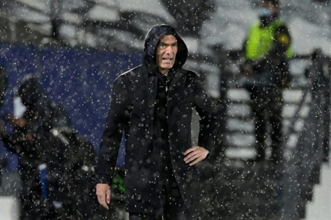 | Zinédine Zidane, l'entraîneur du Real Madrid, lors de la demi-finale aller de Ligue des Champions contre Chelsea, à Valdebebas (banlieue madrilène), le 27 avril. |