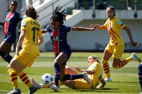 | La défenseure canadienne du Paris-SG, Ashley Lawrence (centre), lutte pour le ballon lors de la demi-finale aller de la Ligue des champions contre Barcelone, à Saint-Germain-en-Laye, le 25 avril. |