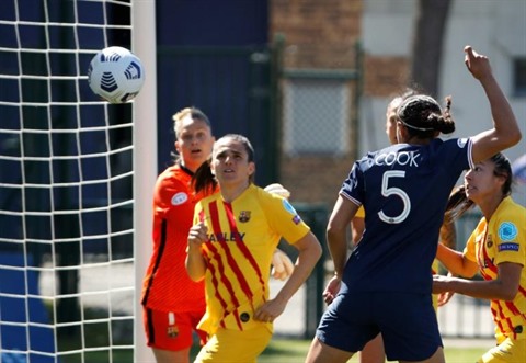 | La défenseure américaine Alana Cook (droite) buteuse lors de la demi-finale de la Ligue des champions contre Barcelone, à Saint-Germain-en-Laye, le 25 avril. |