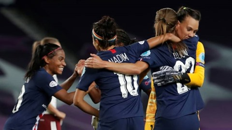 | Les joueuses du Paris-SG fêtent leur victoire en quart de finale de la Ligue des champions face à Arsenal, à San Sebastian, le 22 août. |