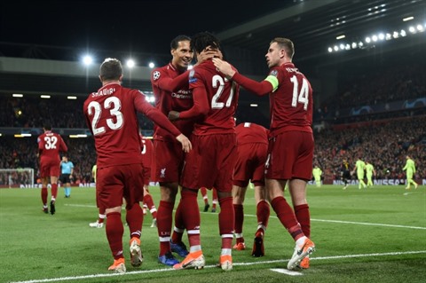 | Le bonheur des joueurs de Liverpool après le 4e but contre Barcelone, celui de la qualification de la finale de la Ligue des champions, le 7 mai à Anfield. |