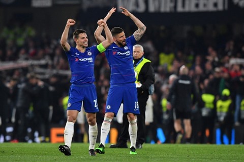 | Le capitaine Cesar Azpilicueta et Olivier Giroud fêtent la victoire de Chelsea contre Francfort en demi-finale de la Ligue Europa, le 9 mai à Stamford Bridge. |